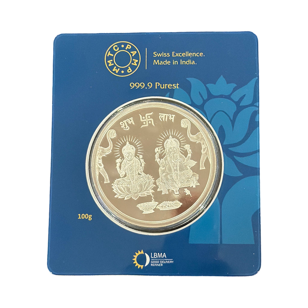 One Lakshmi Ganesh Coin of 100 grams is provided, with a diameter of 70 mm and thickness of 5.0 mm.